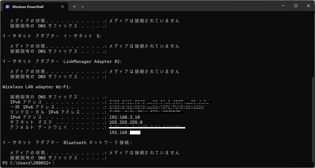 先ほどのコマンドプロンプトで「ipconfig」と入力しアドレスを確認できると書きましたが、基本的に上の画像の様に192.168.xxx.xxなどのアドレスがDHCPサーバーから払い出されていると思います。